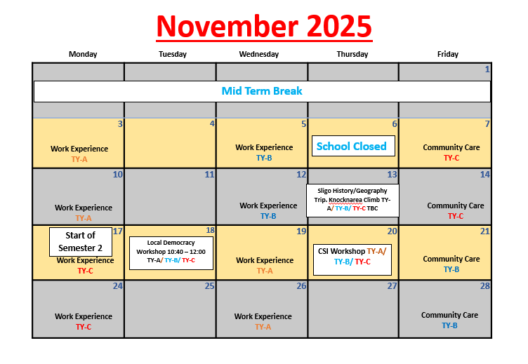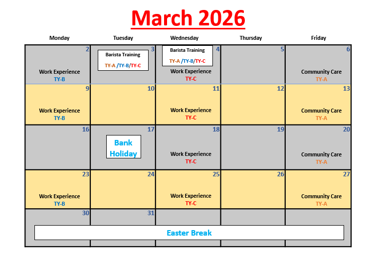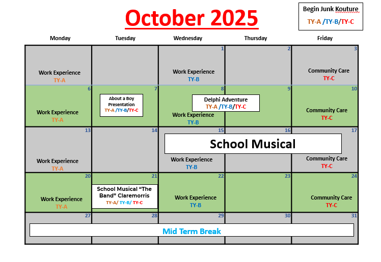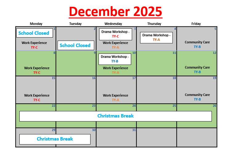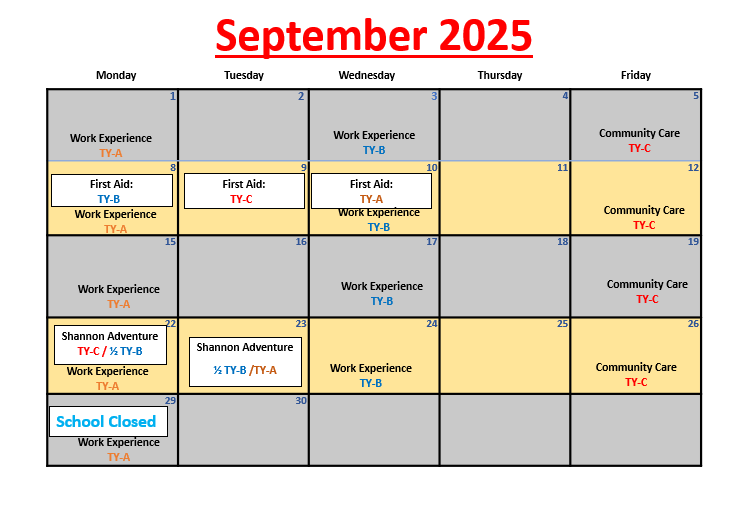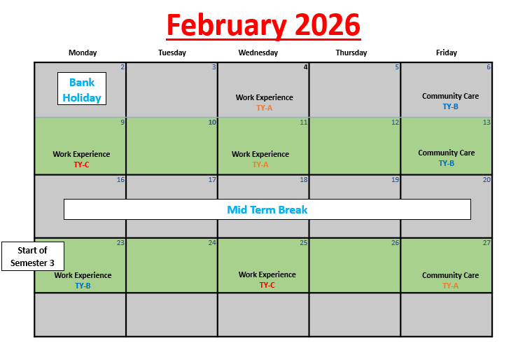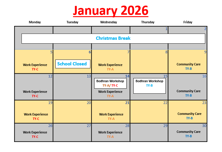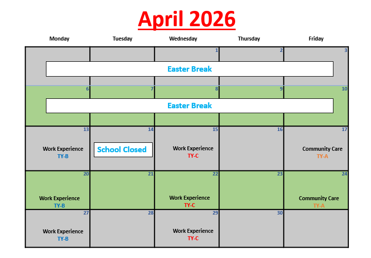 The Transition Year is a year between the end of Junior Certificate and the beginning of Leaving Certificate. The Transition Year programme aims to promote the personal, social, educational and vocational development of students. We hope to enable students to take a greater responsibility for their own learning and decision making. Through work experience we will prepare students for the world of work and we will develop their role as autonomous participative and responsible members of society. The school recognises that assessment is an integral part of teaching and learning process – assessment and certification within Transition Year is school-based