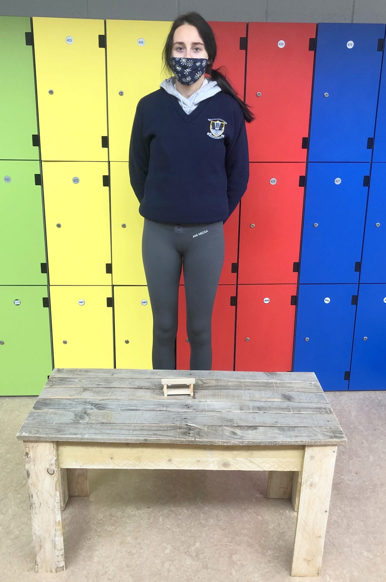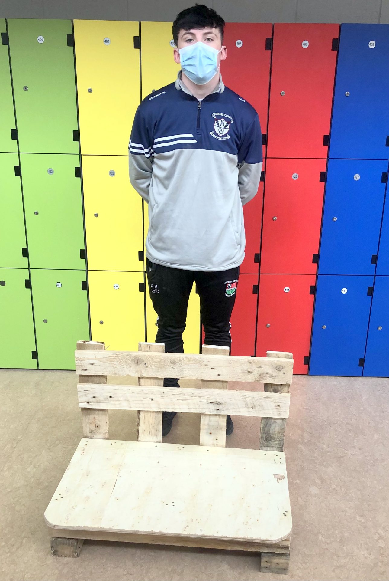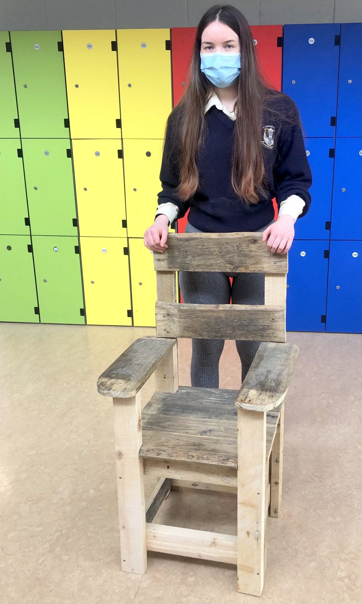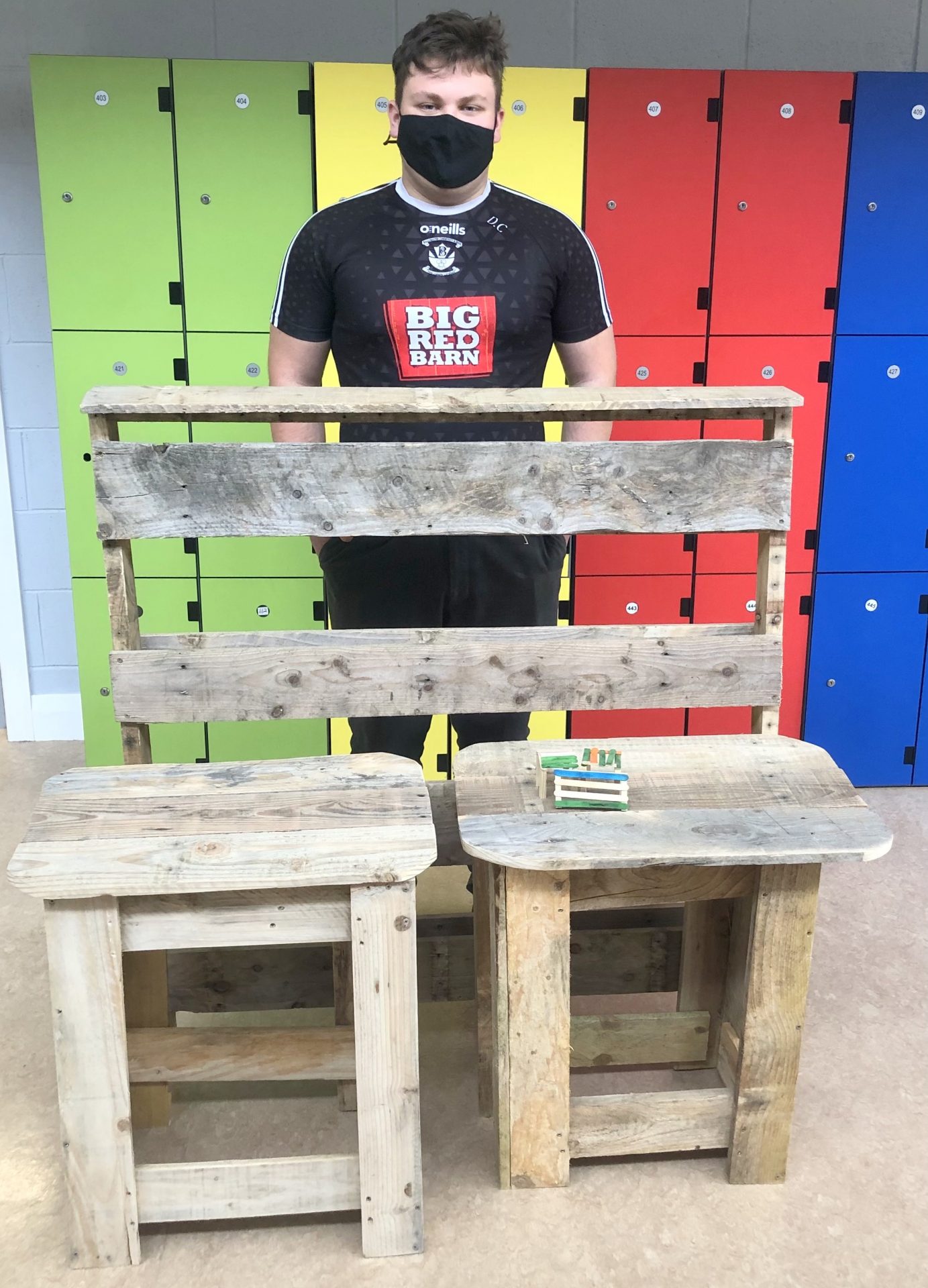 Mr McHugh’s LCA2 students proudly displaying their sustainable furniture projects. The artefacts were designed by the students themselves and manufactured entirely from recycled wood pallets.